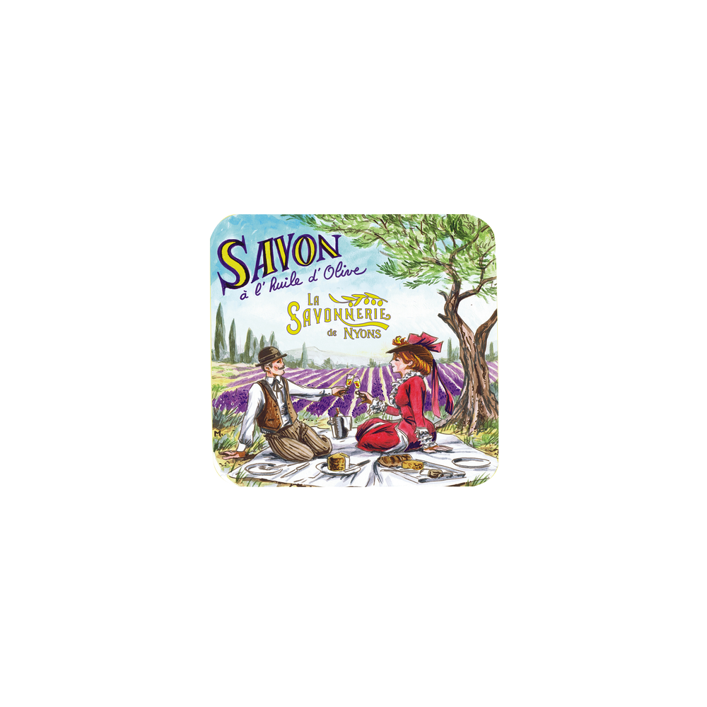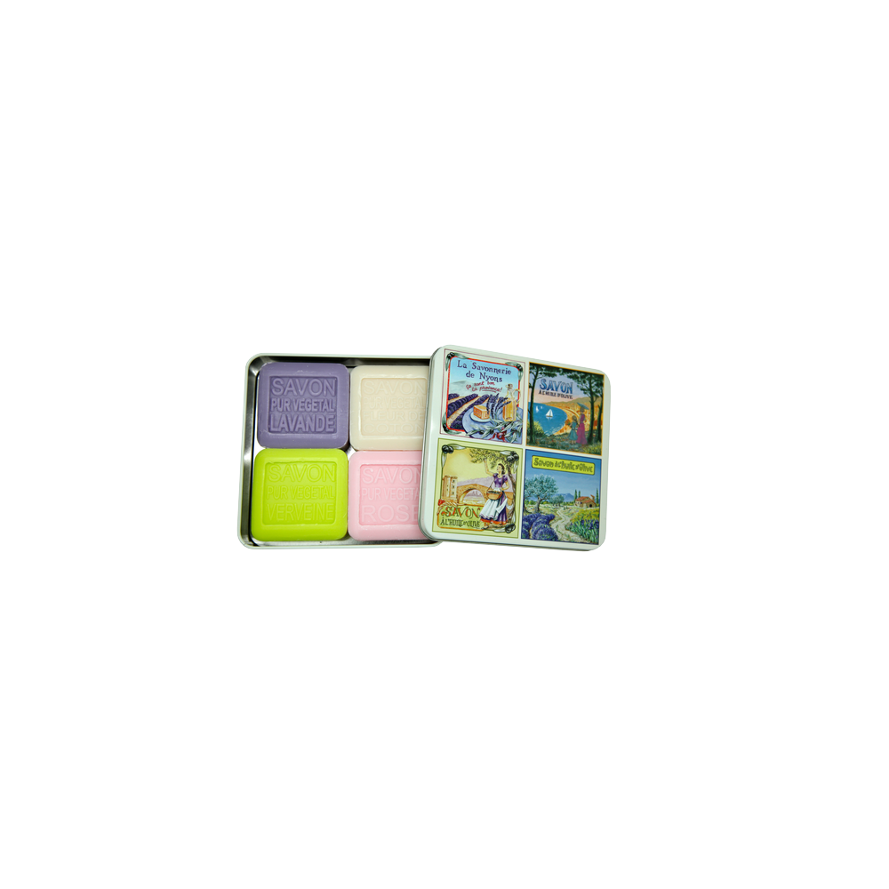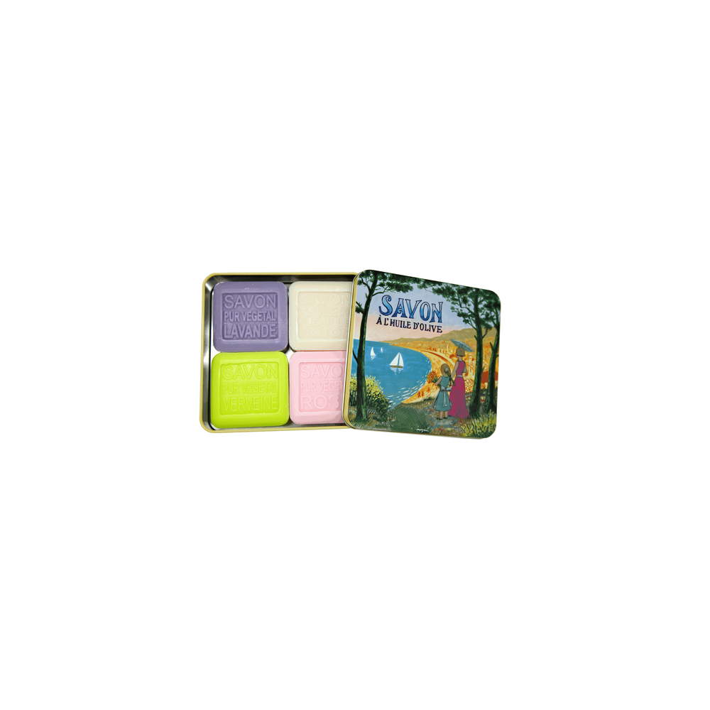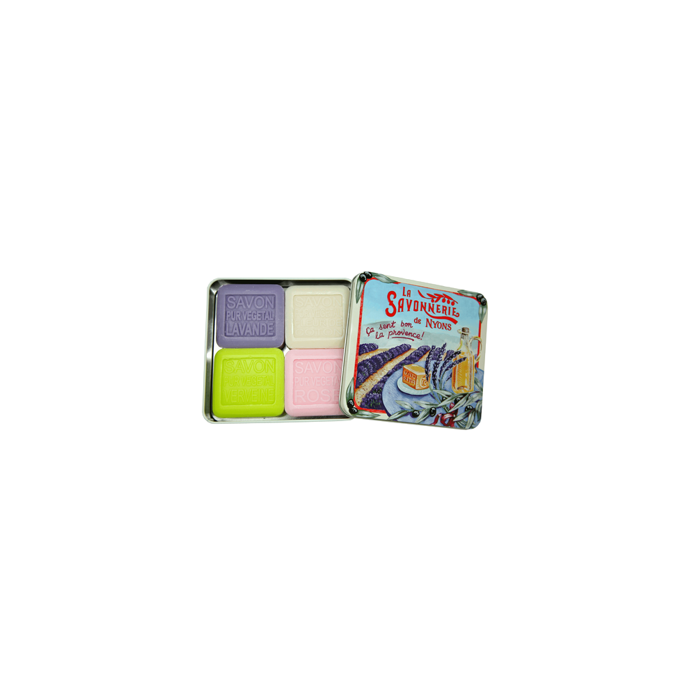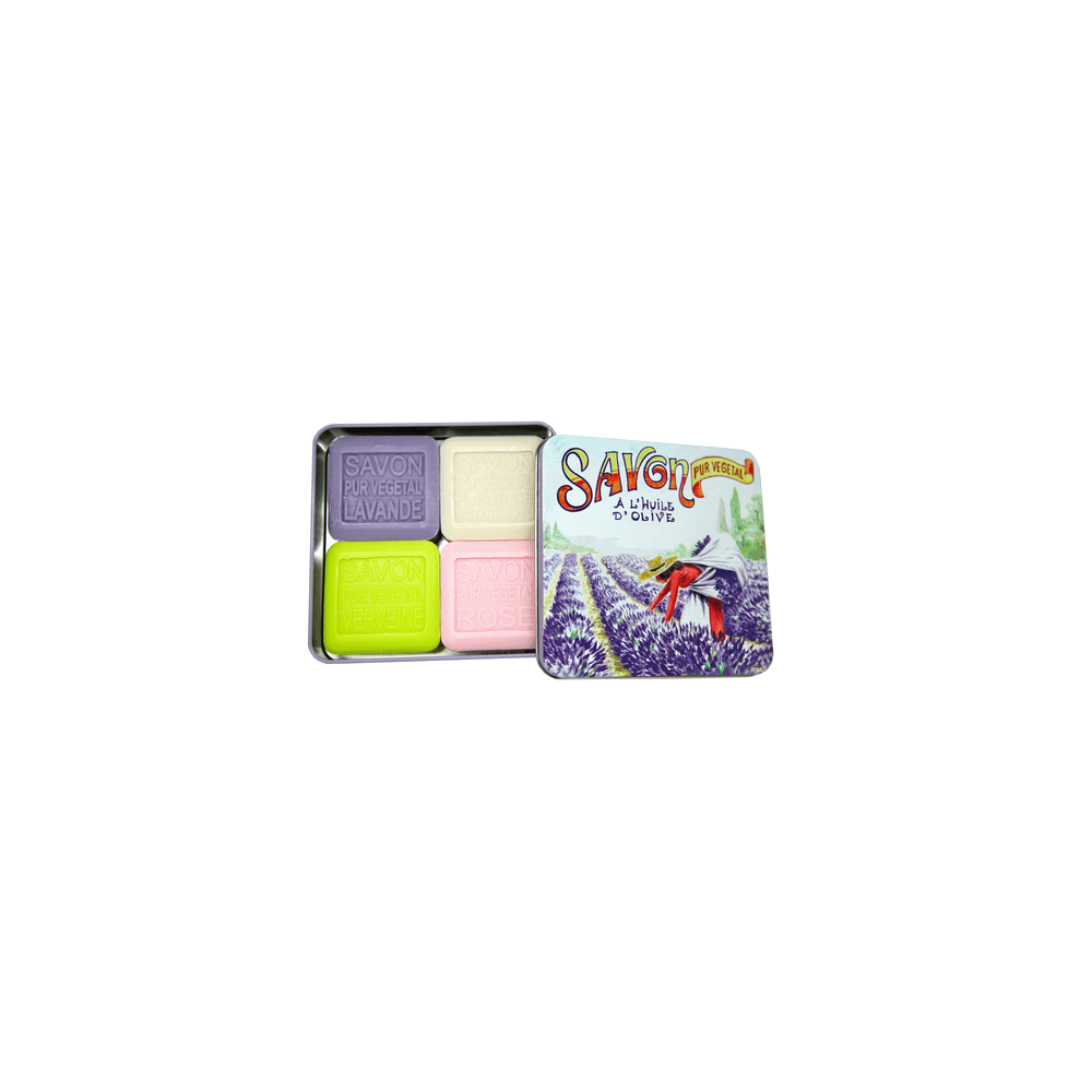 Cette boite métal comporte quatre savons de 100 g parfumés à la Lavande, Verveine, Rose et à la Fleur De Coton.
